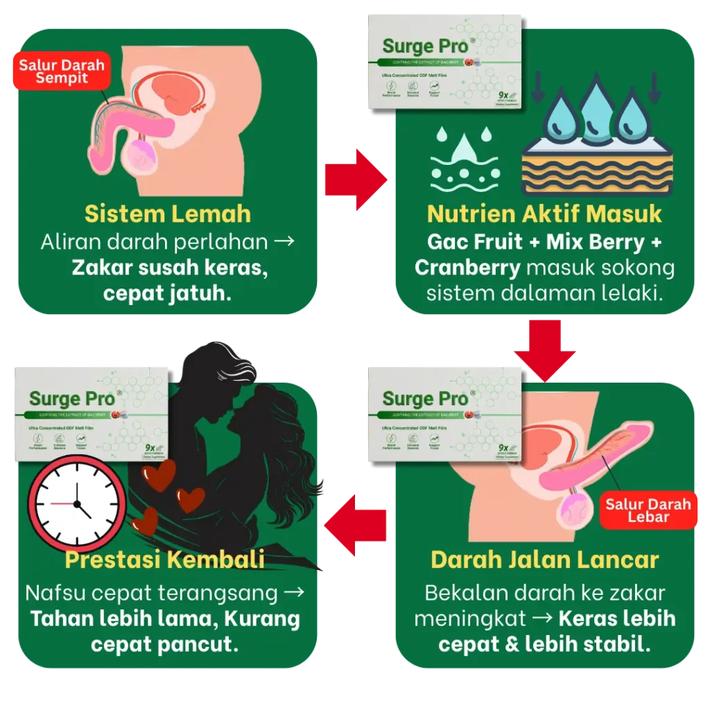 ** Keputusan adalah berdasarkan maklum balas pengguna dan boleh berbeza bagi setiap individu bergantung kepada gaya hidup, pemakanan dan konsistensi penggunaan. SURGE PRO bukan produk perubatan dan tidak menjanjikan hasil tertentu.