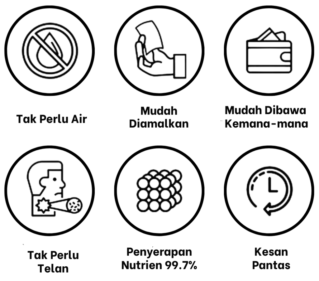Teknologi Nano ODF Film membolehkan nutrien diserap terus — lebih cepat, lebih efisien, tanpa perlu melalui proses penghadaman seperti suplemen biasa.