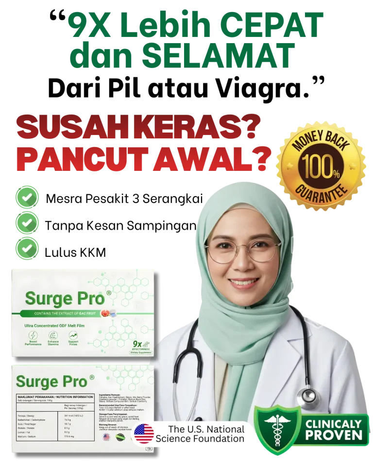Surge Pro® adalah produk sokongan kesihatan. Jika anda mempunyai kondisi perubatan tertentu atau sedang mengambil ubat doktor, disarankan untuk mendapatkan nasihat profesional kesihatan sebelum penggunaan.
